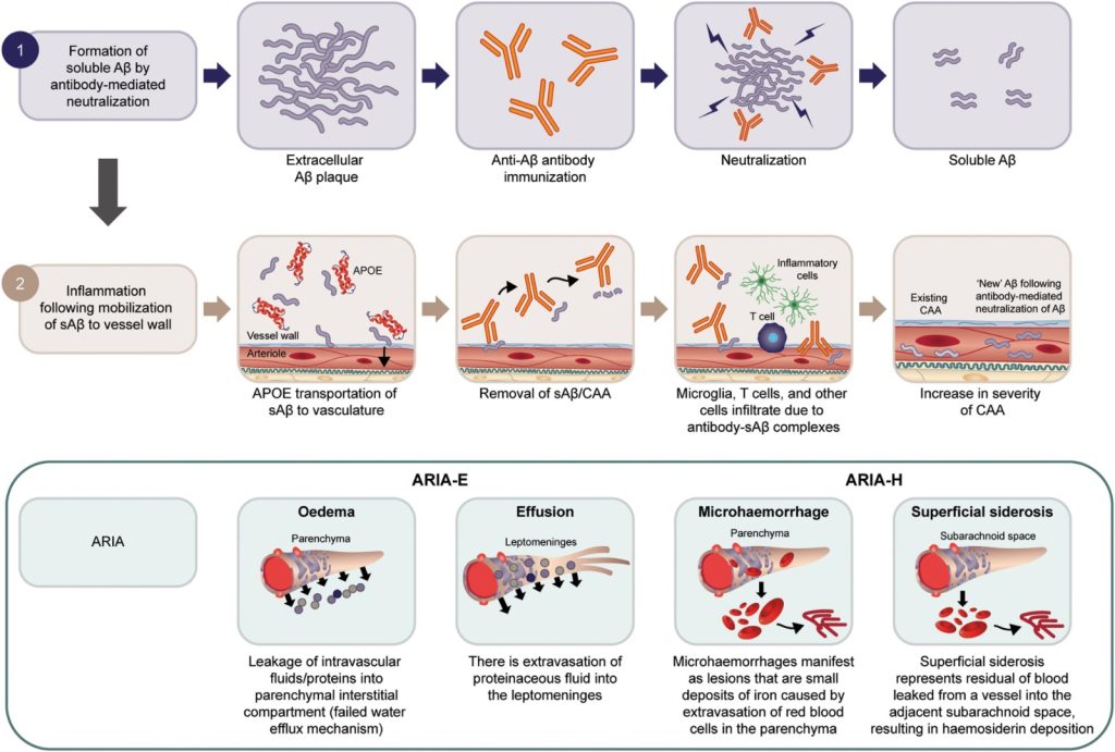 Several amyloid‑β–targeting monoclonal antibodies have received regulatory approval for AD treatment. By clearing amyloid plaques, these agents can normalize amyloid positron emission tomography (PET) scans after several treatment sessions. An important adverse event is ARIA. These MRI‑detectable changes are thought to result from transient increases in blood–brain barrier permeability following rapid plaque removal. ARIA presents in two forms—ARIA‑E (edema/effusion) and ARIA‑H (hemosiderin)—which can occur independently or concurrently.
